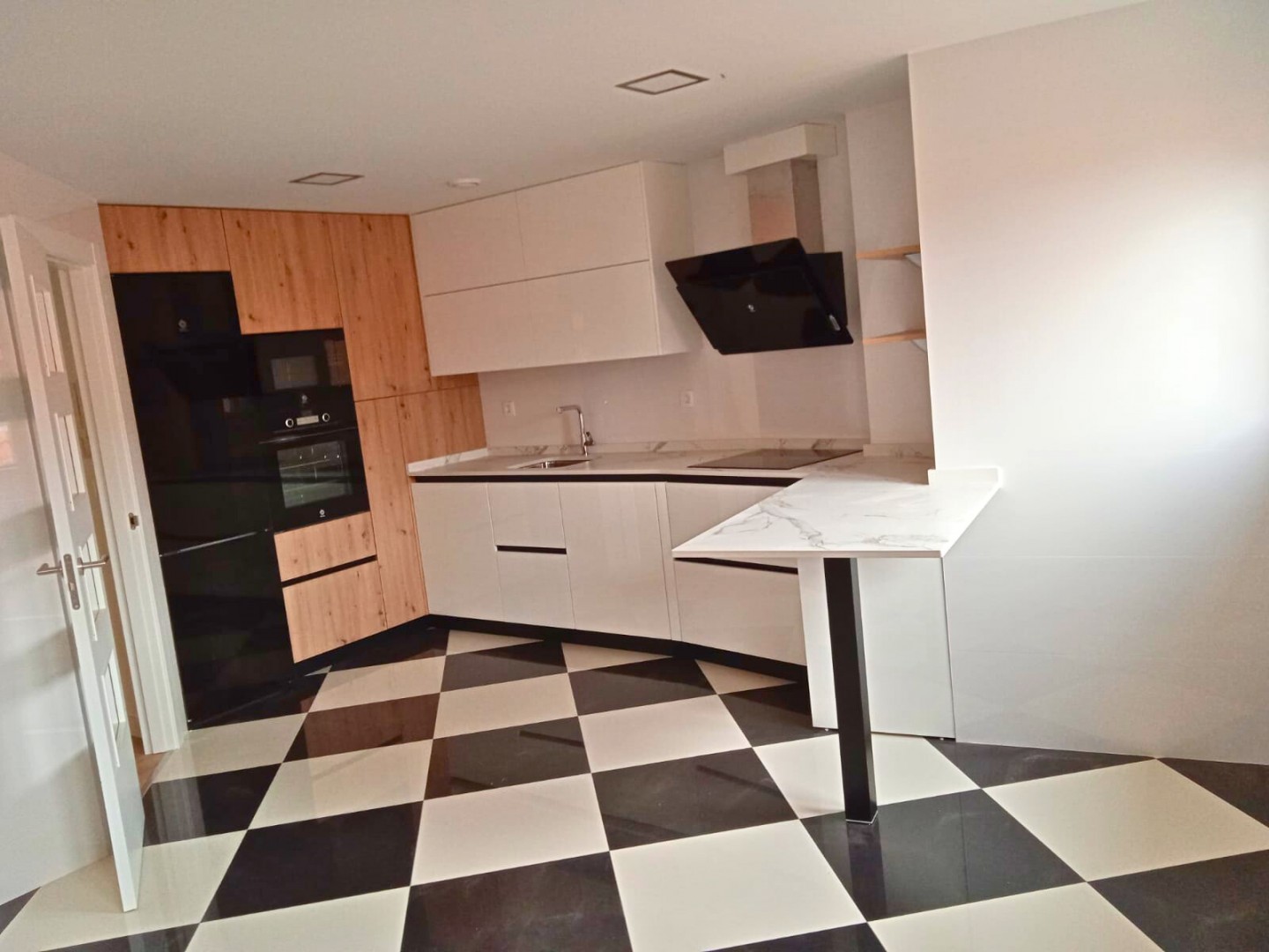 Cocina de estilo moderno contemporáneo, con inspiración nórdica-industrial gracias a la mezcla de madera, blanco y negro. El suelo ajedrezado refuerza el carácter visual del espacio y convierte la cocina en un punto protagonista de la vivienda.