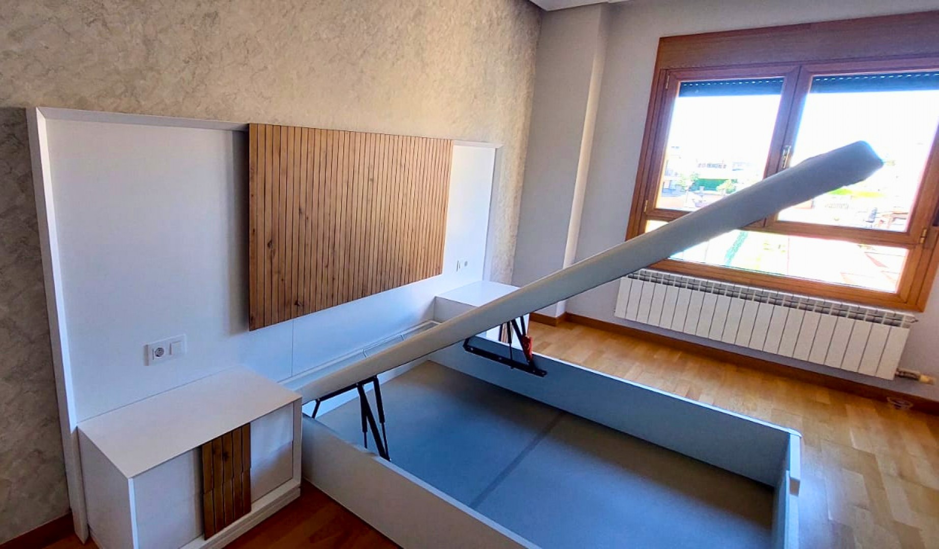 - Cabecero a medida con panel decorativo alistonado.