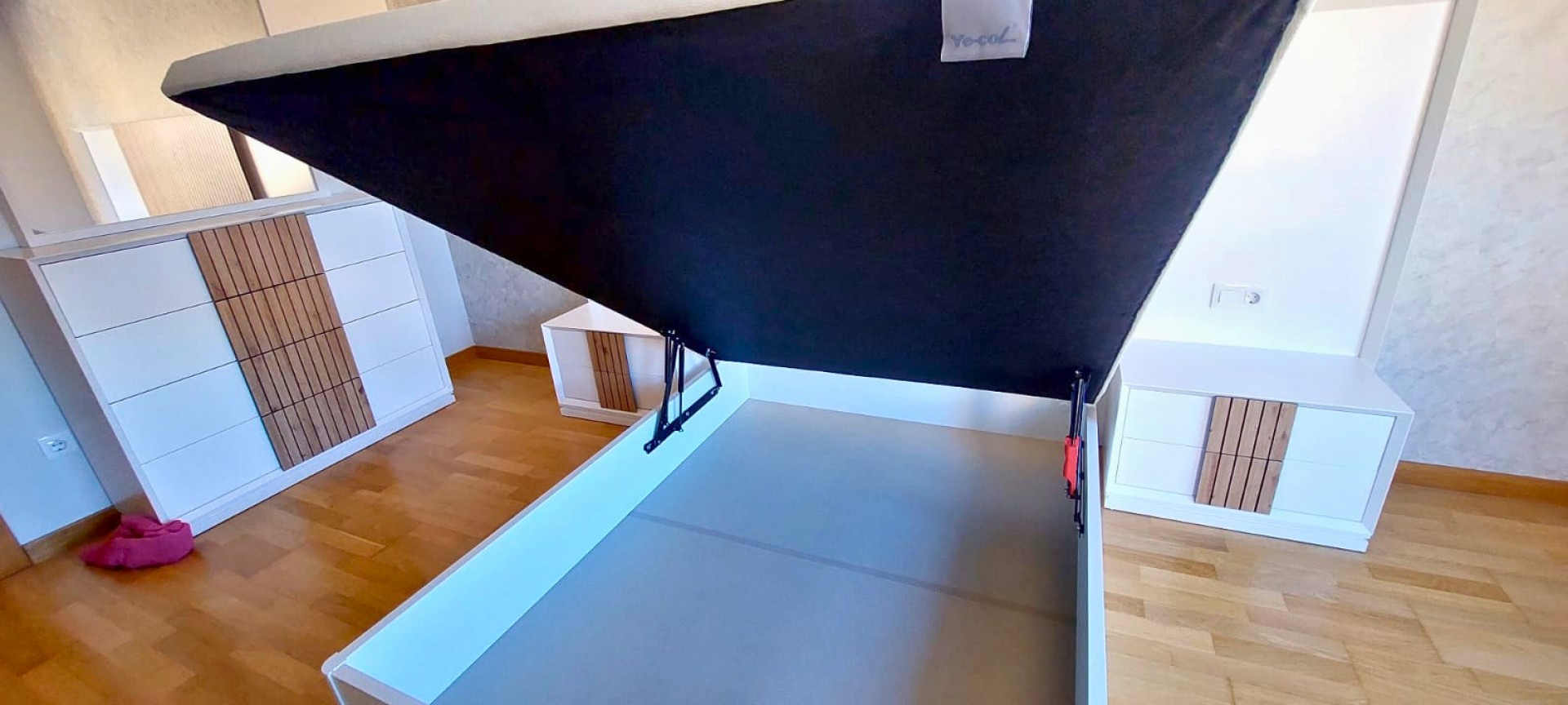 - Cama con canapé abatible, ideal para optimizar el espacio.