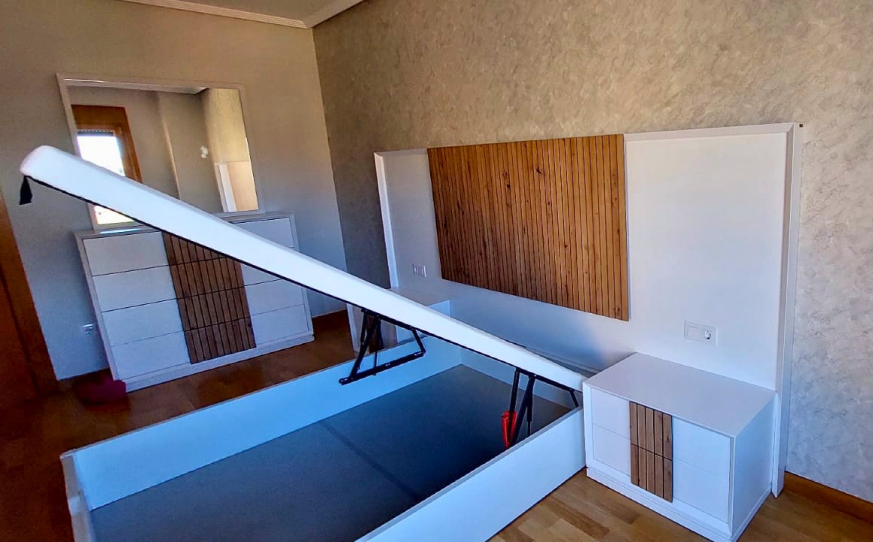 Realizamos un dormitorio moderno diseñado a medida, donde se combina estética contemporánea y máxima funcionalidad. El conjunto está compuesto por una cama abatible, un cabecero decorativo con panel alistonado, mesillas integradas y una cómoda con espejo a juego.