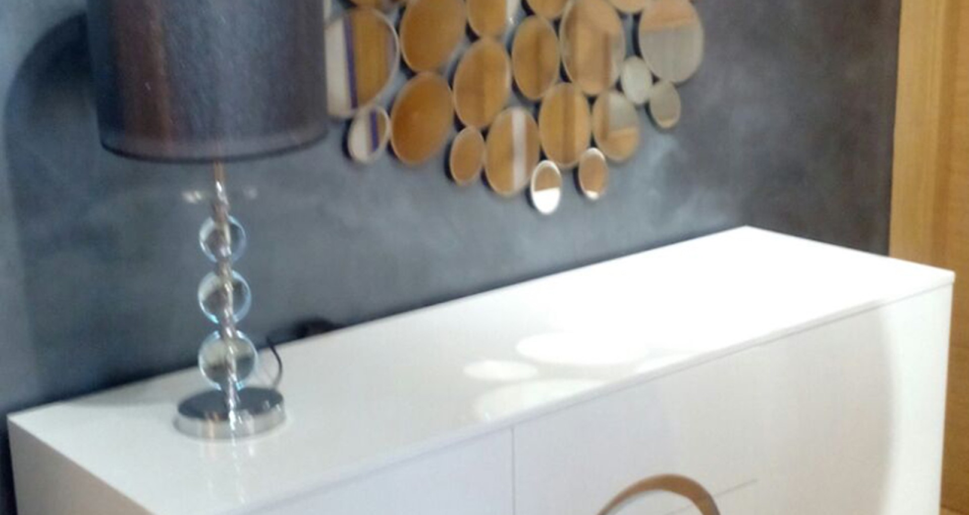 Cada elemento fue elegido y diseñado pensando en la armonía visual del espacio. El aparador cuenta con líneas limpias, acabado lacado en brillo y un detalle circular metálico en plata que actúa como pieza focal.